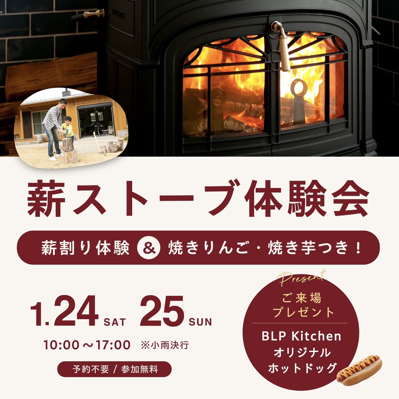 【1月24日(土)、25日(日)開催】薪割り&焼きりんご体験が楽しめる!│薪ストーブ体験会
